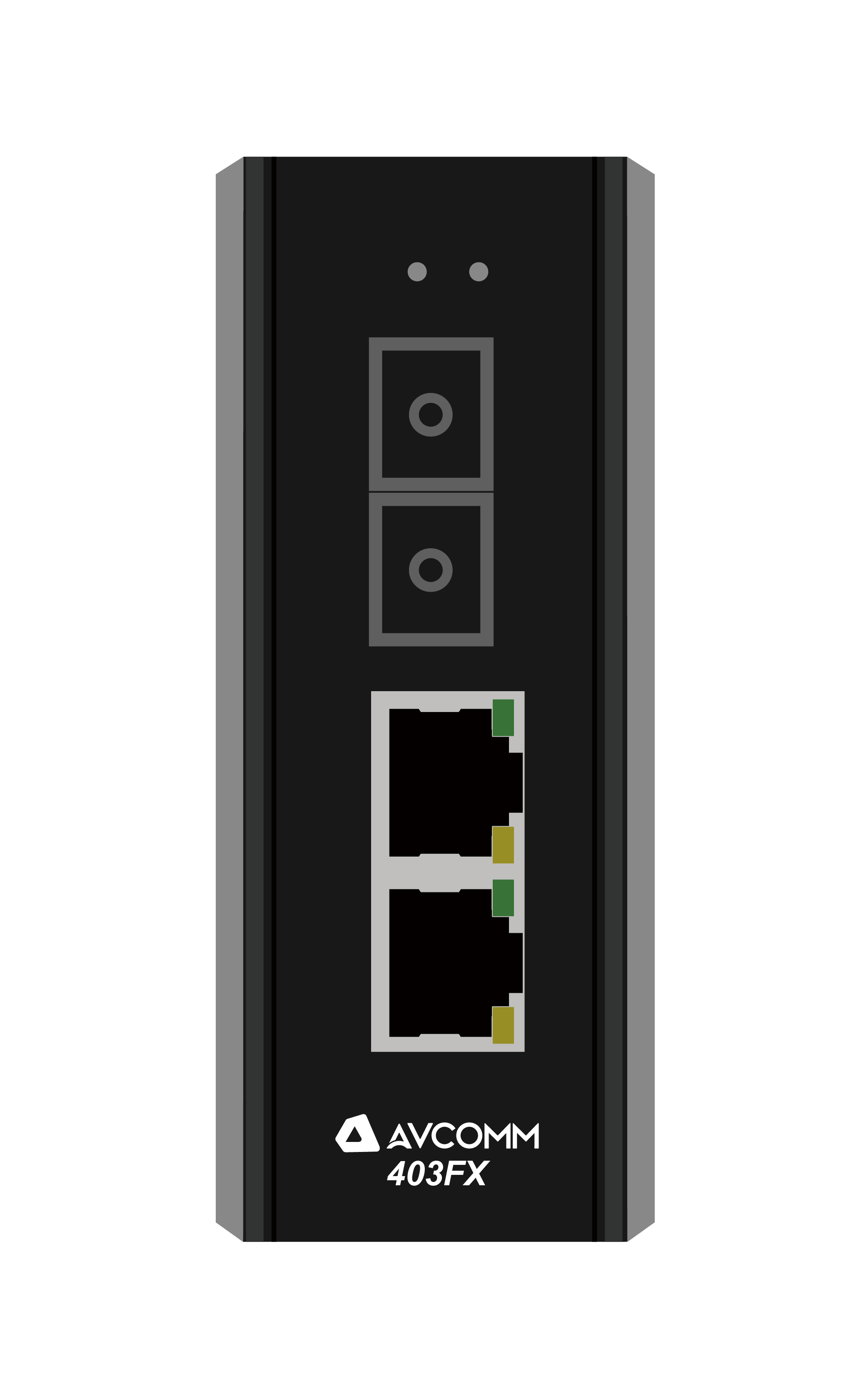 AVCOMM 403FX is a 3-port plug and play fast unmanaged Ethernet switch with reverse polarity protection of AC or DC input for automation and electrical OEM purpose. It has wide operation temperature range, high EMC performance to ensure stable work in harsh industrial environments and supports DIN Rail-mounted to facilitate in various industrial network applications. AVCOMM 403FX is suitable for industrial applications such as industrial automation, intelligent transportation, video surveillance, and electrical OEMs.