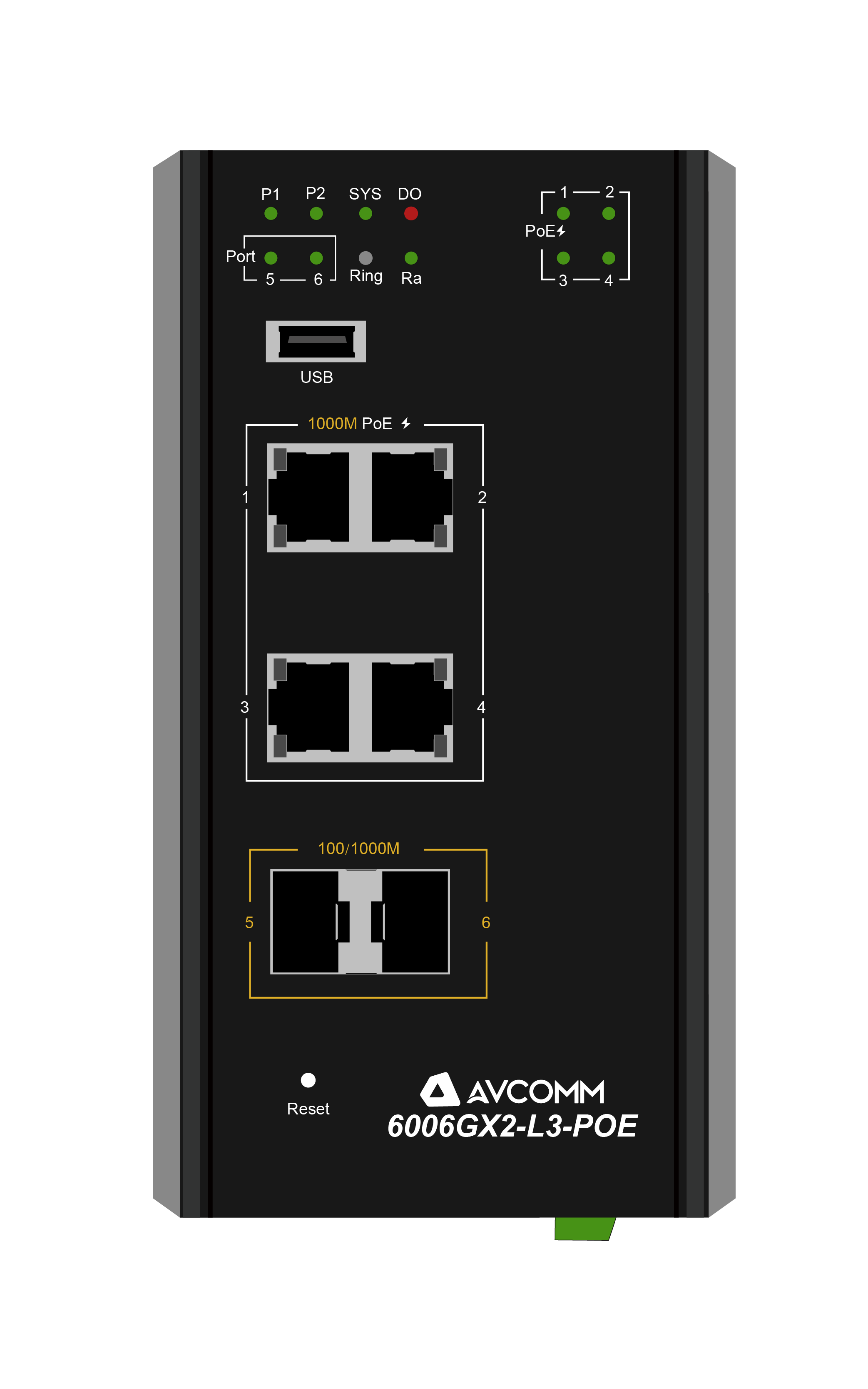 6-Port Industrial Fully Managed POE Switch, 4 RJ45 10/100/1000BaseT(X), 2 SFP Slots 1000BaseSFP+, Support POE/POE+, Support ITU-TG.8032, DIN-Rail, Dual Power Input 46-57VDC, -40°C-75°C